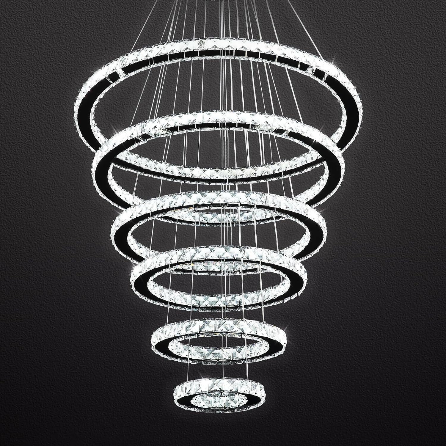 Siljoy Modern Crystal Chandelier Lighting, 6 Ring Chandelier LED Ceiling Lights Fixtures with 3-Color, High Ceiling Foyer Chandeliers for Living Room Dining Room Staircase, D8-12-16-20-24″-28″