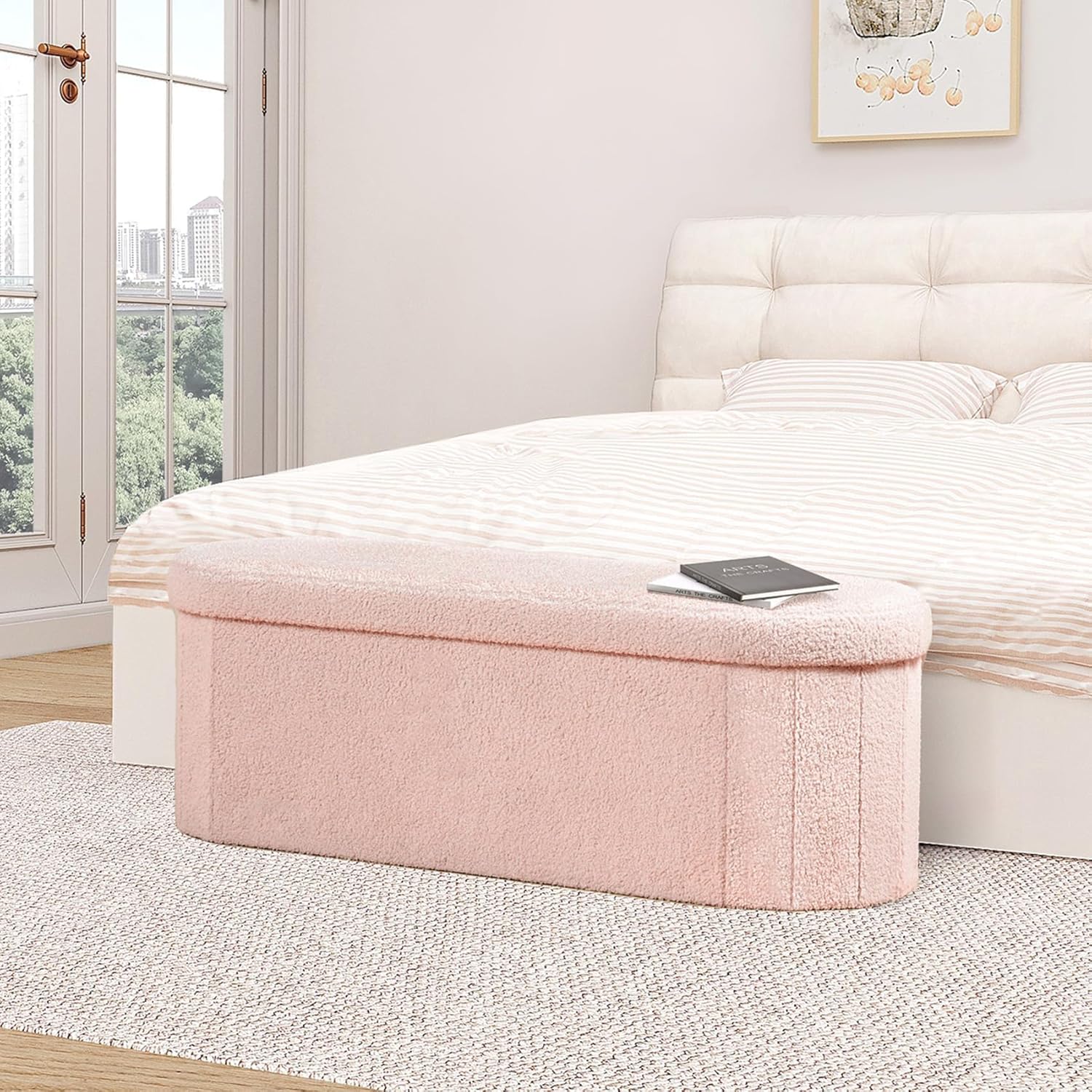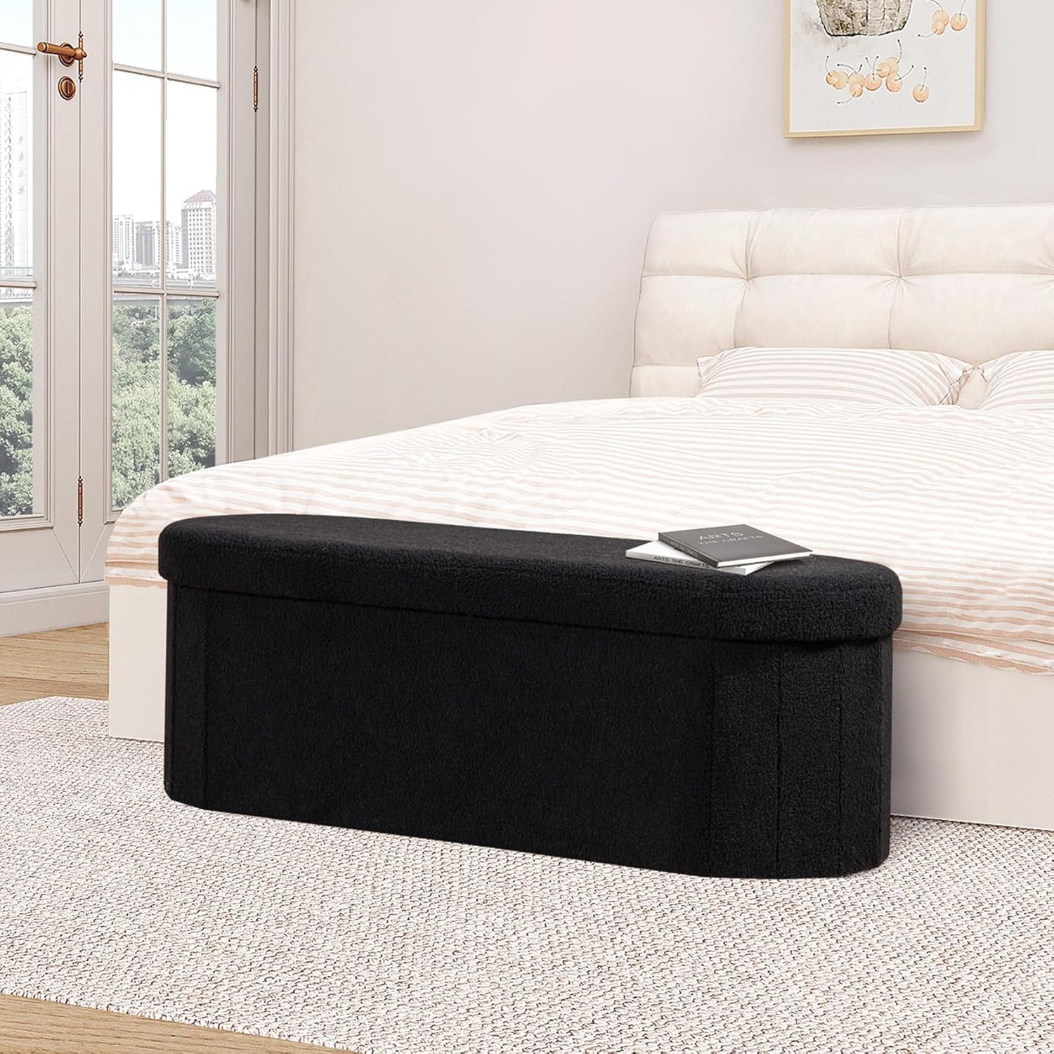 B FSOBEIIALEO Ottoman with Storage for Living Room, Sherpa Folding Storage Ottoman Foot Rest, 43.3 Inches Collapsible Bedroom Bench White